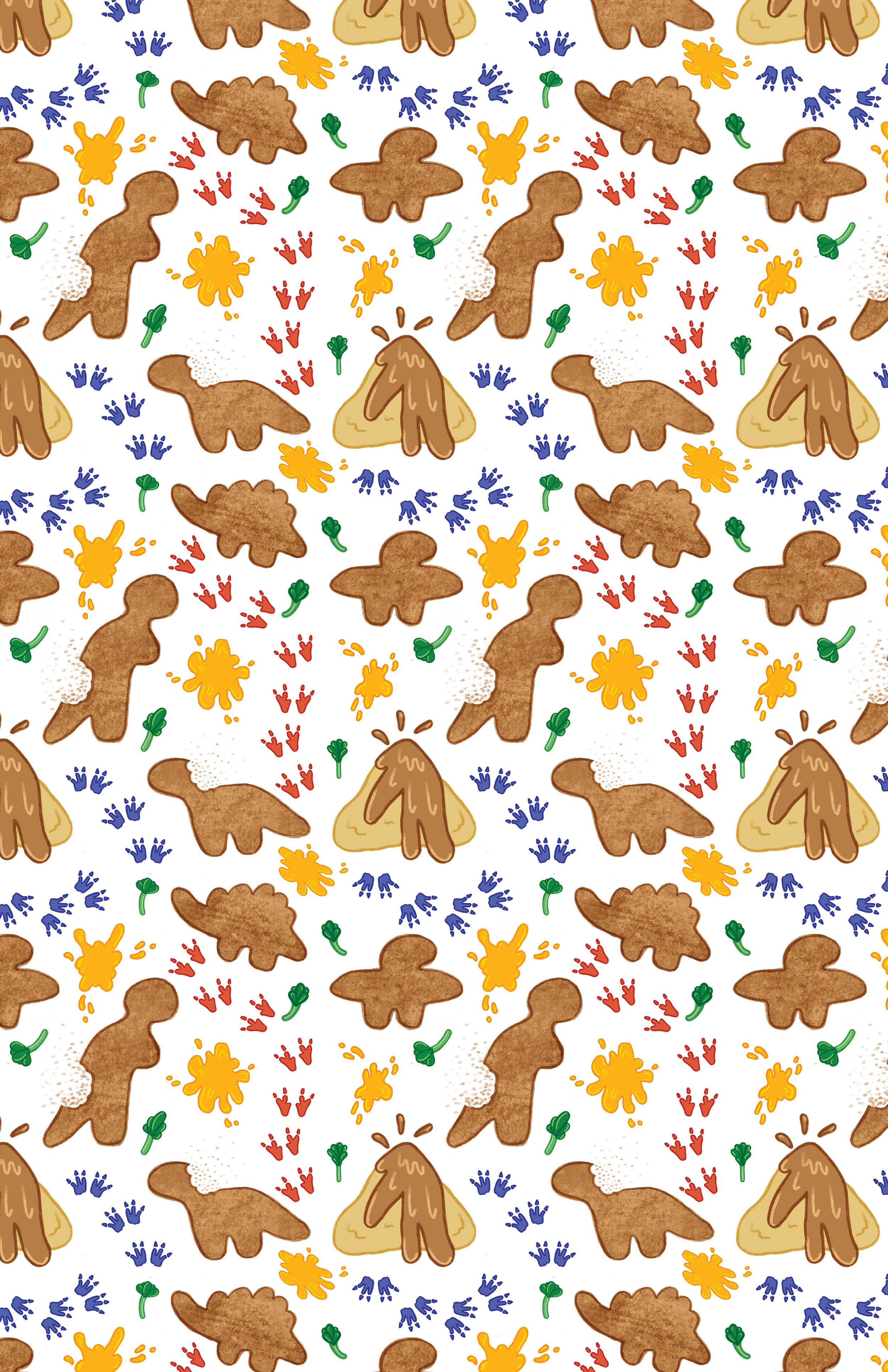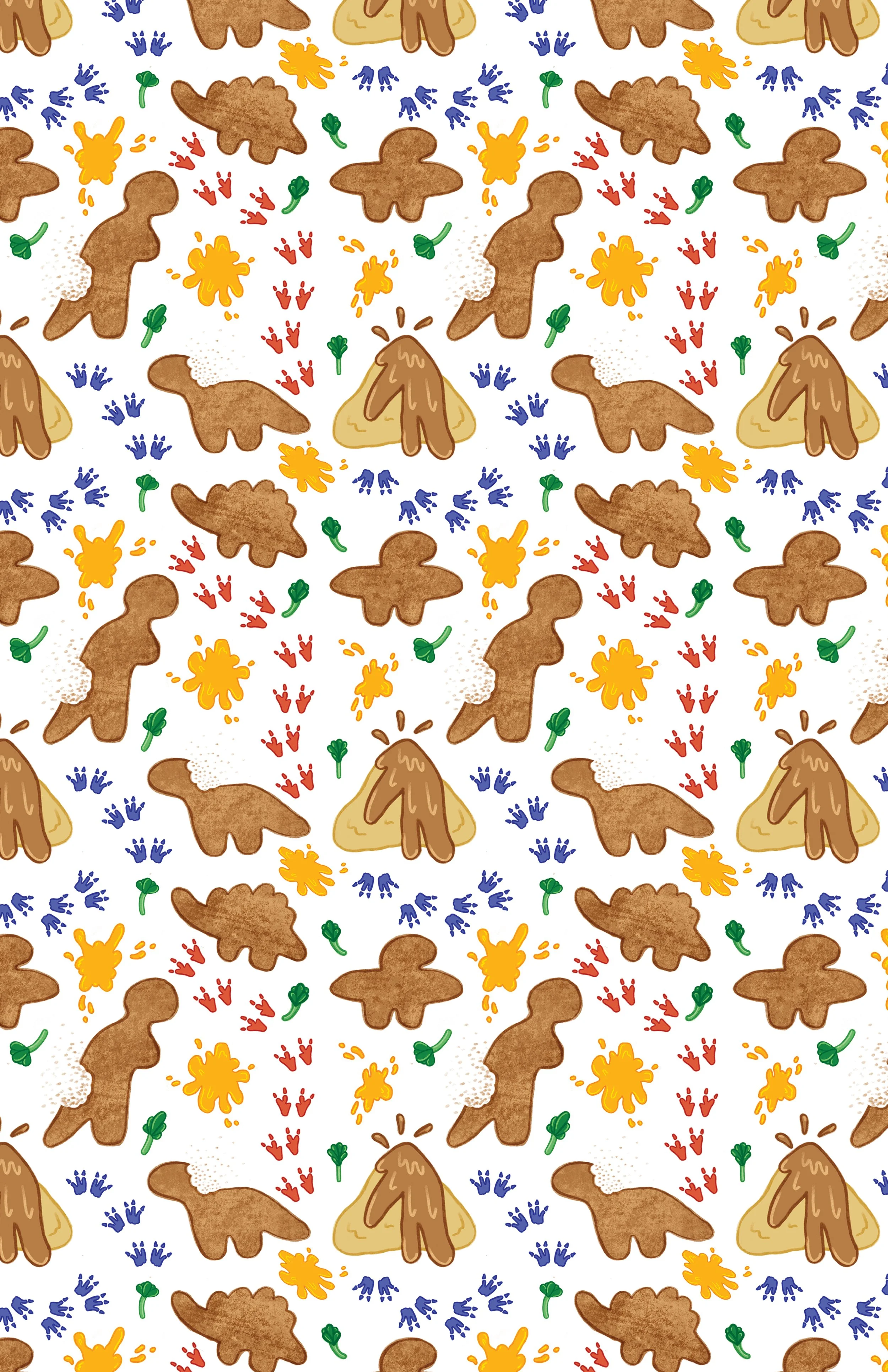 Dinosaur nugget bedsheets with mashed potato volcanoes, broccoli florets, and cheese sauce splats